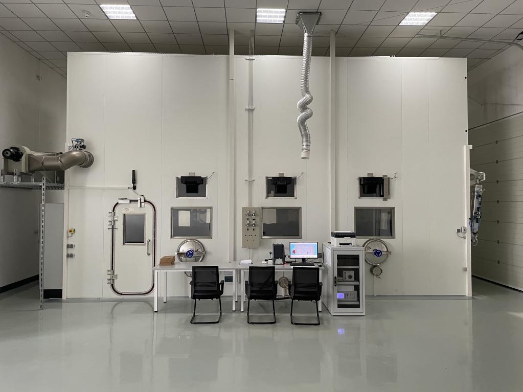 的涉氢高低温环境舱,该舱将阳光模拟系统发热部件外置于环境舱外,同时将环境舱内旋转部件低位布置,配有氢气传感器和危险气体吹扫系统,极大地提高了试验安全系数。该试验间